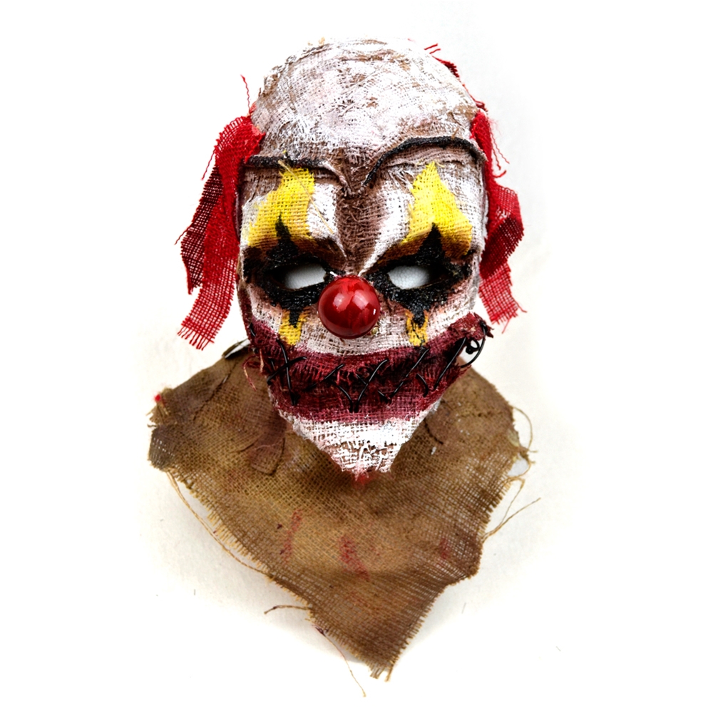 Terrorize trick-or-treaters this Halloween with the Stitched Burlap Clown Mask. The molded burlap clown mask includes traditional clown features all composed of burlap, including the eyes, mouth and red clown hair. A red nose, black stitching on the mouth and a padded inside complete the features on this scary clown mask that is sure to be a hit this Halloween.